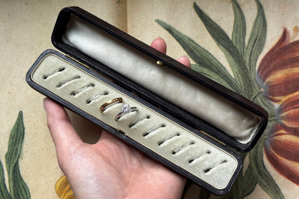 C.1900. A highly sought-after antique, this multi-ring box is in superb, well-preserved condition. The exterior is crafted from a rich, dark brown leather, while the interior features a clean ecru velvet and a silk-lined lid. This box holds 12 rings and appears to have been barely, if ever, used. The original press-closure is fully functional, closing securely with a crisp click. Unlike modern conversions, this is an authentic, original piece, making it a rare and valuable find for any collector. The rings shown are for display purposes only. We also have a similar antique box for 7 rings available in our shop.